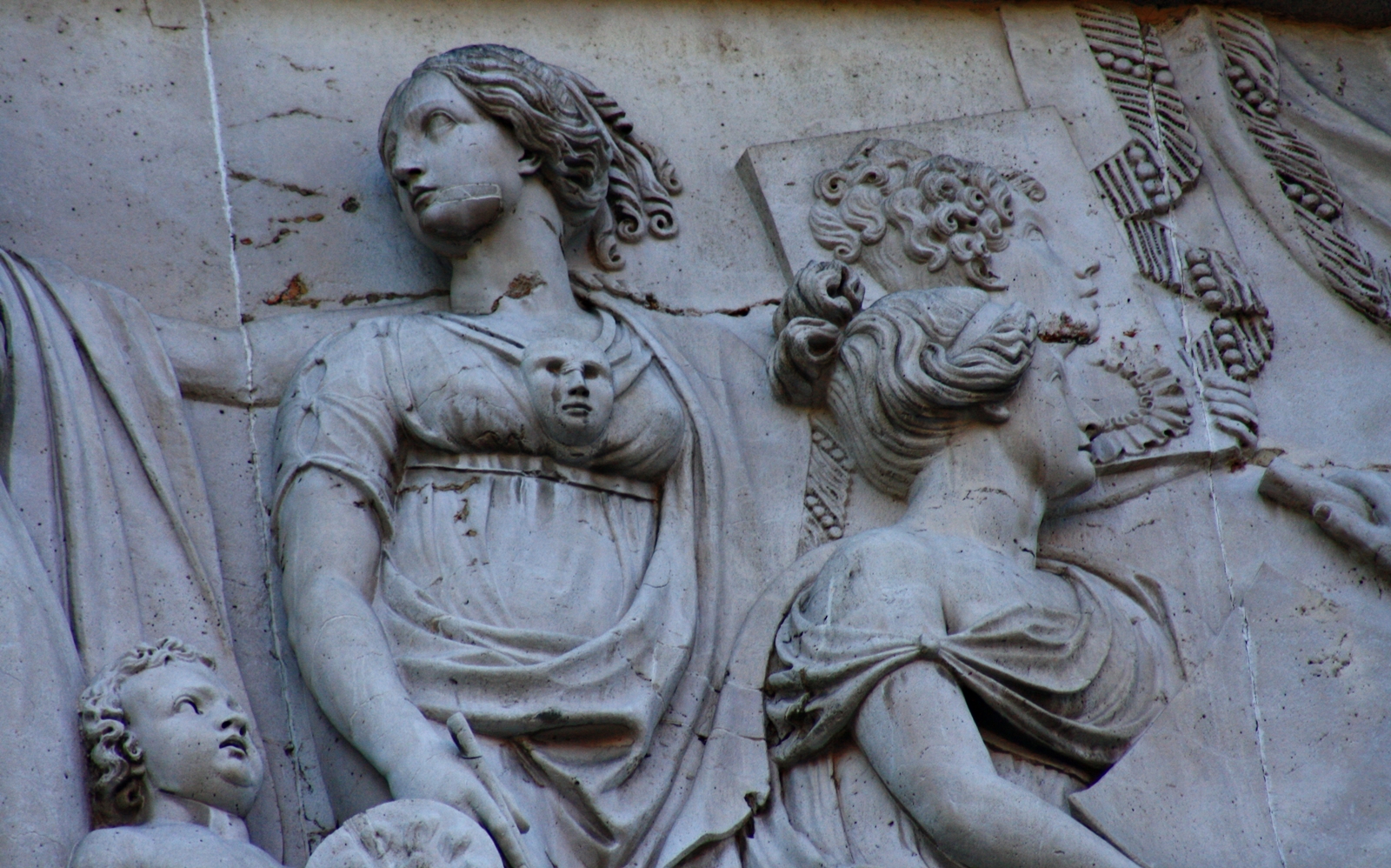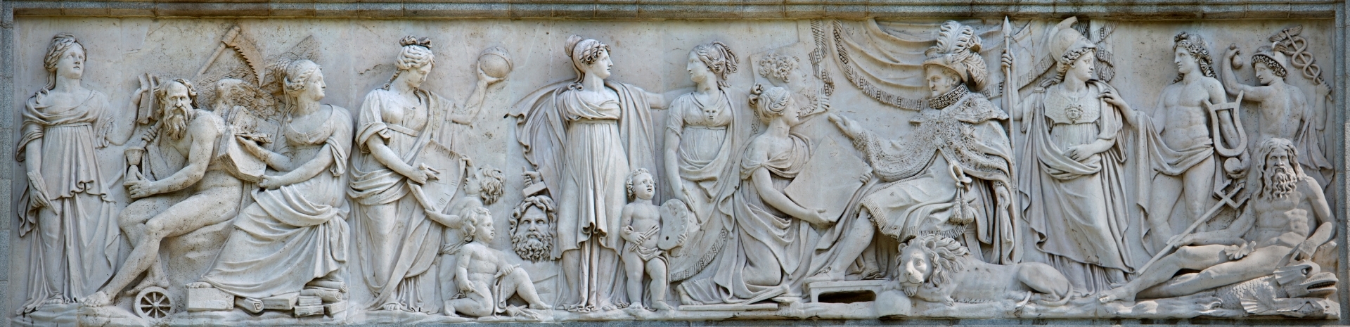 Intentar identificar al resto de personajes según su aspecto y los objetos que portan es un ejercicio divertido para aquellos a los que os guste la mitología. Empezando por la izquierda, vemos una composición de tres figuras. Clío, musa de la historia, escribe sentada sobre la alegoría del Tiempo, identificado con el dios Saturno, que porta un reloj de arena y la guadaña con la que cercenó los testículos de su padre Urano. A su izquierda, una Alegoría de las Letras. Siguiendo hacia la derecha vemos a Urania, otra de las nueve Musas, en este caso protectora de la ciencia astronómica. Es el motivo por el que porta un globo terráqueo -u otro planeta- en una mano e instrumentos de geometría y medición del tiempo en la otra.