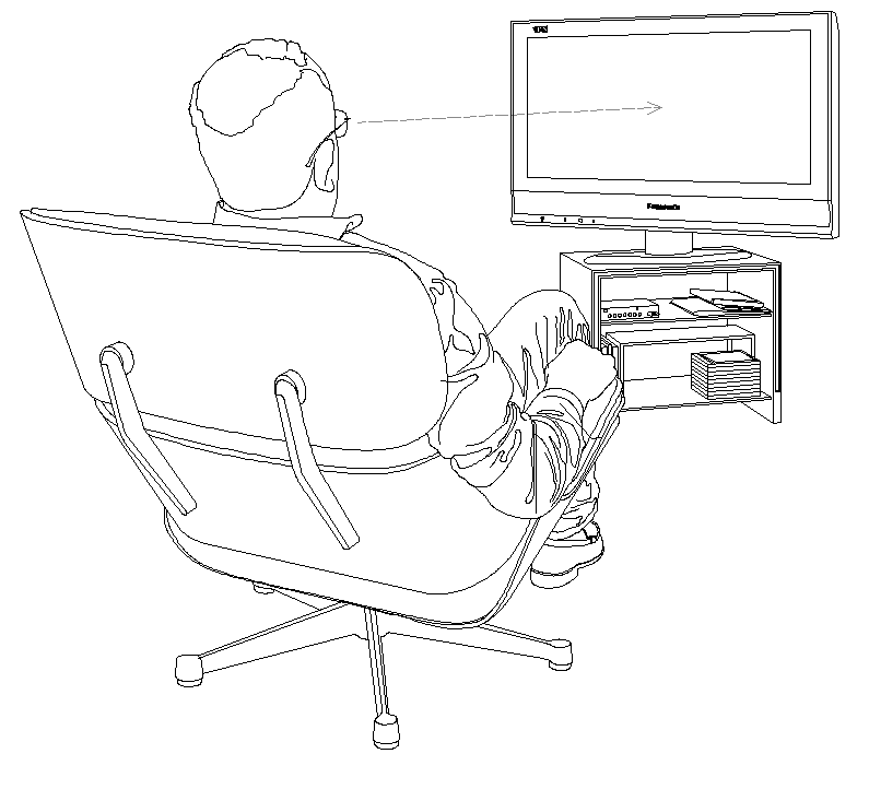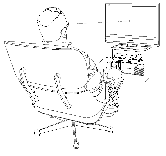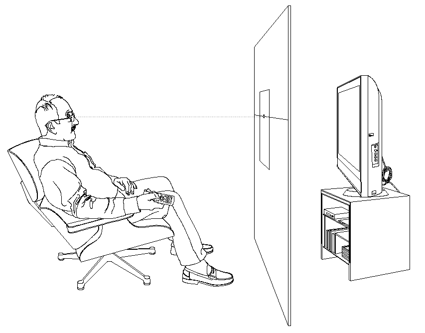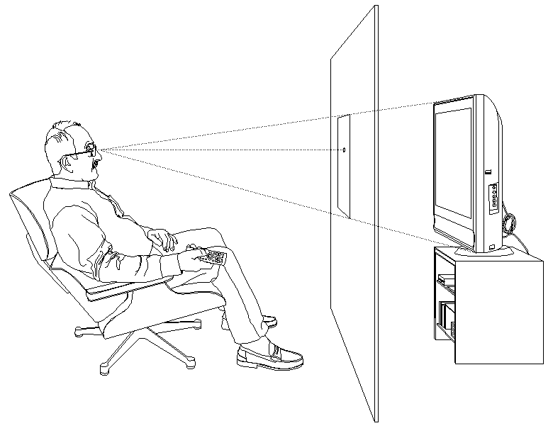 A semejanza del capítulo anterior, se parte de la imagen de un observador, en este caso sentado en un sillón Eames, que dirige su mirada a un televisor y a la mesilla que le sirve de soporte. En el primer supuesto, el rayo visual principal se dirige perpendicularmente hacia la pantalla, formando con ella un ángulo de 90 grados, guardando parte de las líneas del televisor y la mesilla estricto paralelismo entre sí. La imagen percibida o perspectiva resultante se corresponde con la figura número 3. Las líneas del dibujo en perspectiva resultan horizontales o concurrentes en un único punto de fuga (punto central).