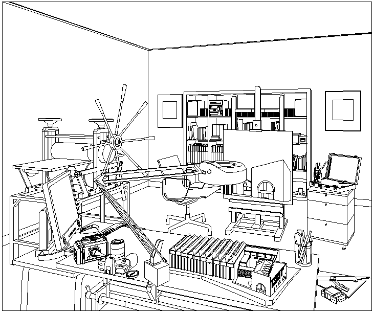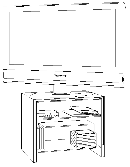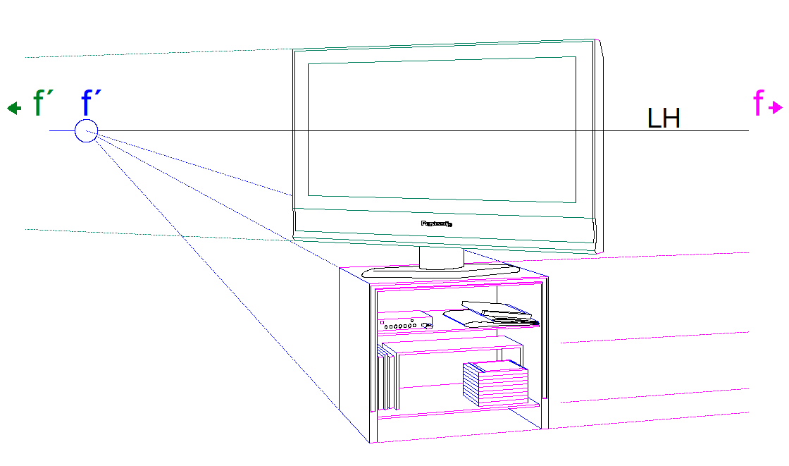 En el segundo supuesto, el observador conserva la posición anterior, incluida la dirección del rayo visual principal. La mesilla y el televisor se han girado independientemente una del otro, perdiéndose con ello el paralelismo y originándose líneas en diferentes direcciones y sus correspondientes puntos de concurrencia. En este caso la imagen que percibe se corresponde con la figura nº 6 construida con cuatro puntos de fuga.
